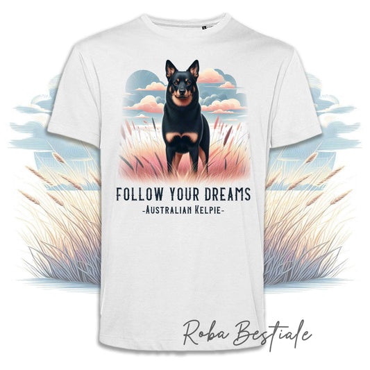 T-Shirt QUOTES "DREAM" - AUSTRALIAN KELPIE Black Tricolor - Bianca, Uomo o Donna - dalla XS alla 5XL