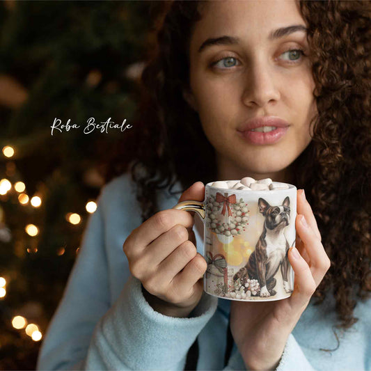 Tazza COZY WINTER - BOSTON TERRIER Tigrato - In Ceramica, con manico color Oro - 330 ml
