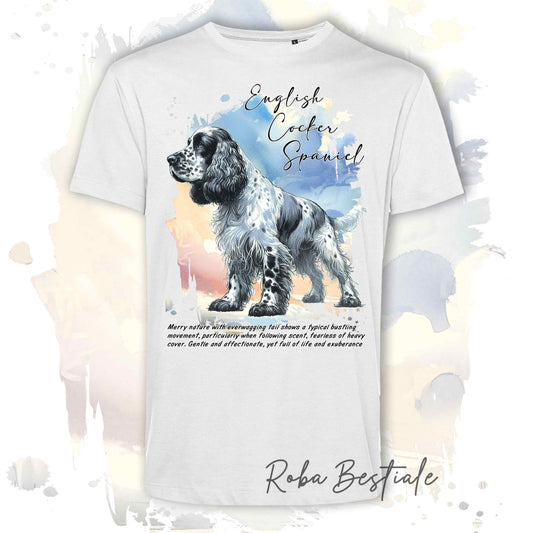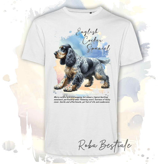 T-Shirt BEHAVIOR - COCKER SPANIEL INGLESE Blu Roano Focato - Standard FCI - 100% Cotone, Bianca, Uomo o Donna - dalla XS alla 5XL