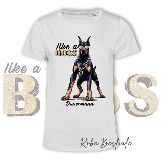 T-Shirt LIKE A BOSS - DOBERMANN - 100% Cotone, Bianca, Uomo o Donna - dalla XS alla 5XL