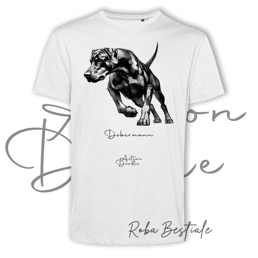 T-Shirt ACTION DOODLE - DOBERMANN 1 - 100% Cotone, Bianca, Uomo o Donna - dalla XS alla 5XL