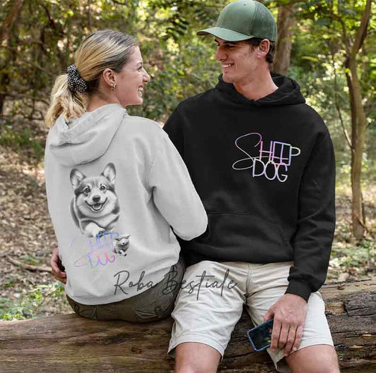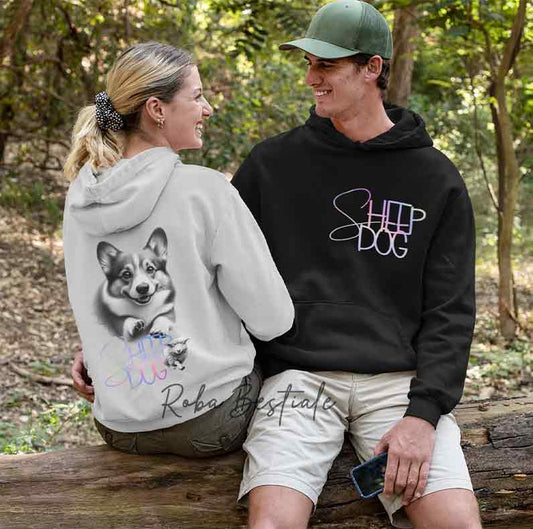 Felpa FLASHY SHEEPDOG - WELSH CORGI PEMBROKE - Unisex - Nera o Grigia - dalla XS alla 3XL - Scritta Olografica Cangiante!
