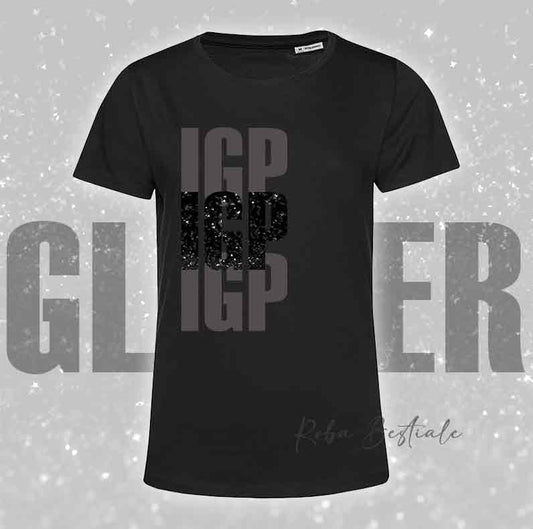 T-Shirt SOLO SCRITTE - IGP - Nera, scritta GLITTER Ultra Brillante in colore a scelta - Uomo o Donna - dalla XS alla 5XL