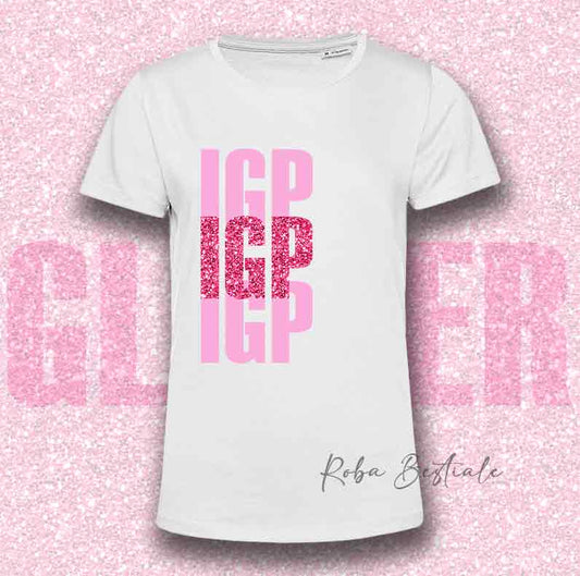 T-Shirt SOLO SCRITTE - IGP - Bianca, scritta GLITTER Ultra Brillante in colore a scelta - Uomo o Donna - dalla XS alla 5XL