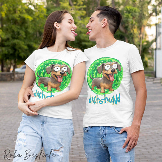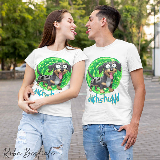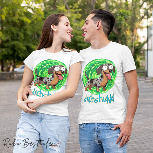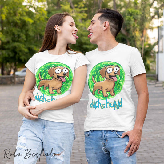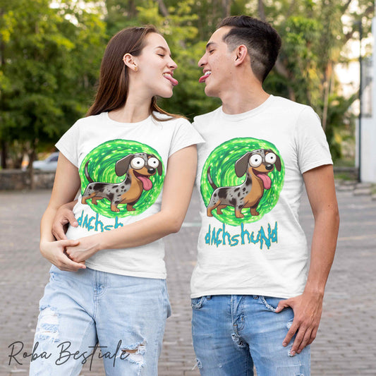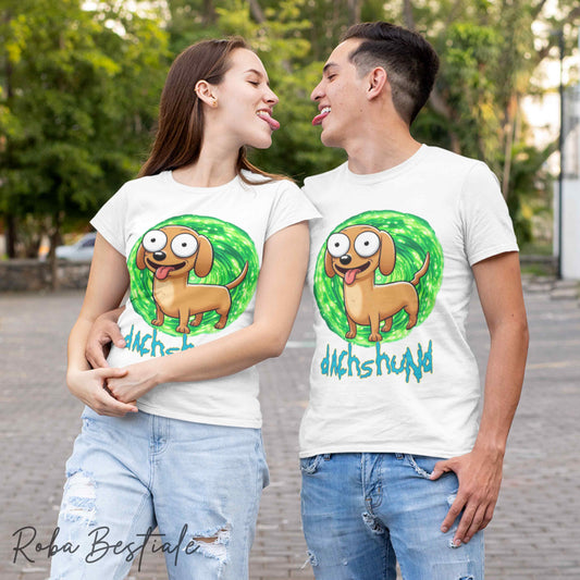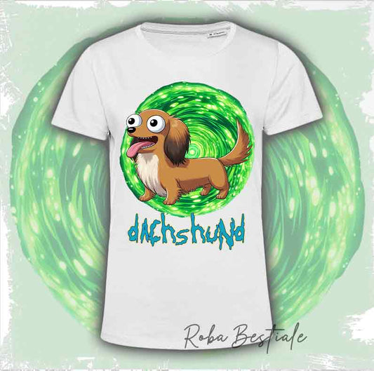 T-Shirt RICK & MORTY - BASSOTTO TEDESCO a Pelo Lungo - Arlecchino Marrone - Bianca, dalla XS alla 5XL