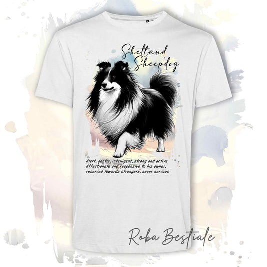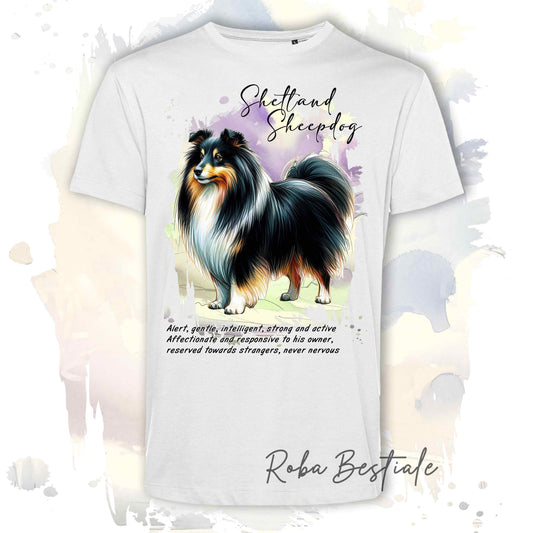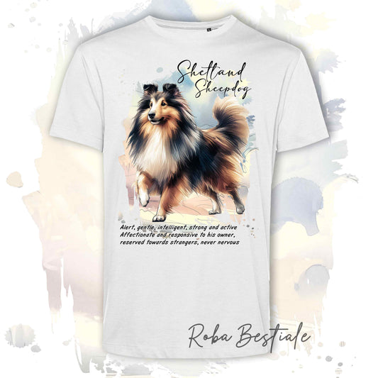 T-Shirt BEHAVIOR - SHETLAND SHEEPDOG Fulvo Zibellino - Standard FCI - 100% Cotone, Bianca, Uomo o Donna - dalla XS alla 5XL