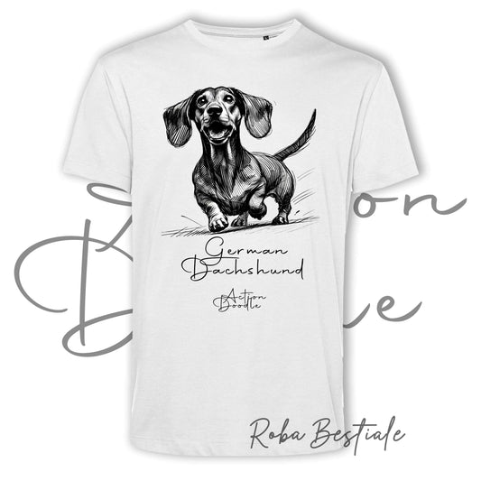 T-Shirt ACTION DOODLE - BASSOTTO TEDESCO a Pelo Corto 1 - 100% Cotone, Bianca, Uomo o Donna - dalla XS alla 5XL
