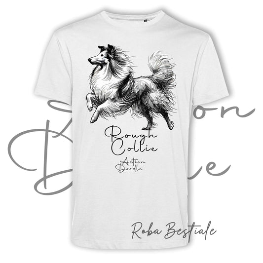 T-Shirt ACTION DOODLE - CANE DA PASTORE SCOZZESE a Pelo Lungo 1 - 100% Cotone, Bianca, Uomo o Donna - dalla XS alla 5XL