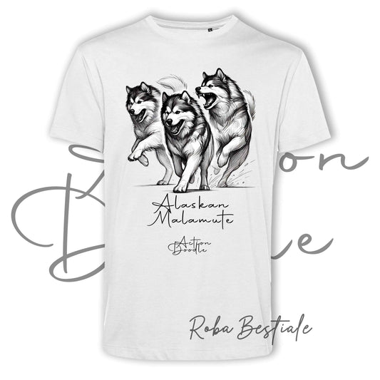 T-Shirt ACTION DOODLE - ALASKAN MALAMUTE 1 - 100% Cotone, Bianca, Uomo o Donna - dalla XS alla 5XL