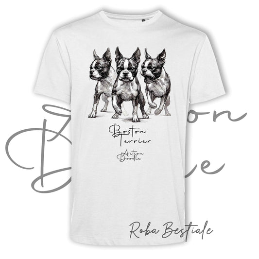 T-Shirt ACTION DOODLE - BOSTON TERRIER 1 - 100% Cotone, Bianca, Uomo o Donna - dalla XS alla 5XL