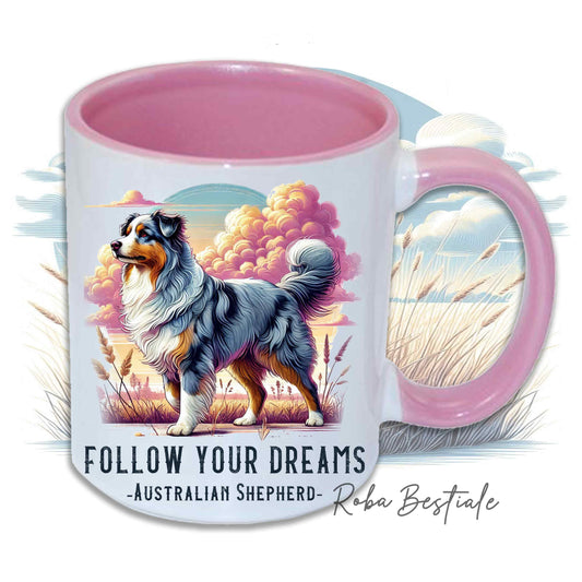 Tazza QUOTES "DREAM" - AUSTRALIAN SHEPHERD Blue Merle - In Ceramica, con manico e interno in diversi colori - 330 ml