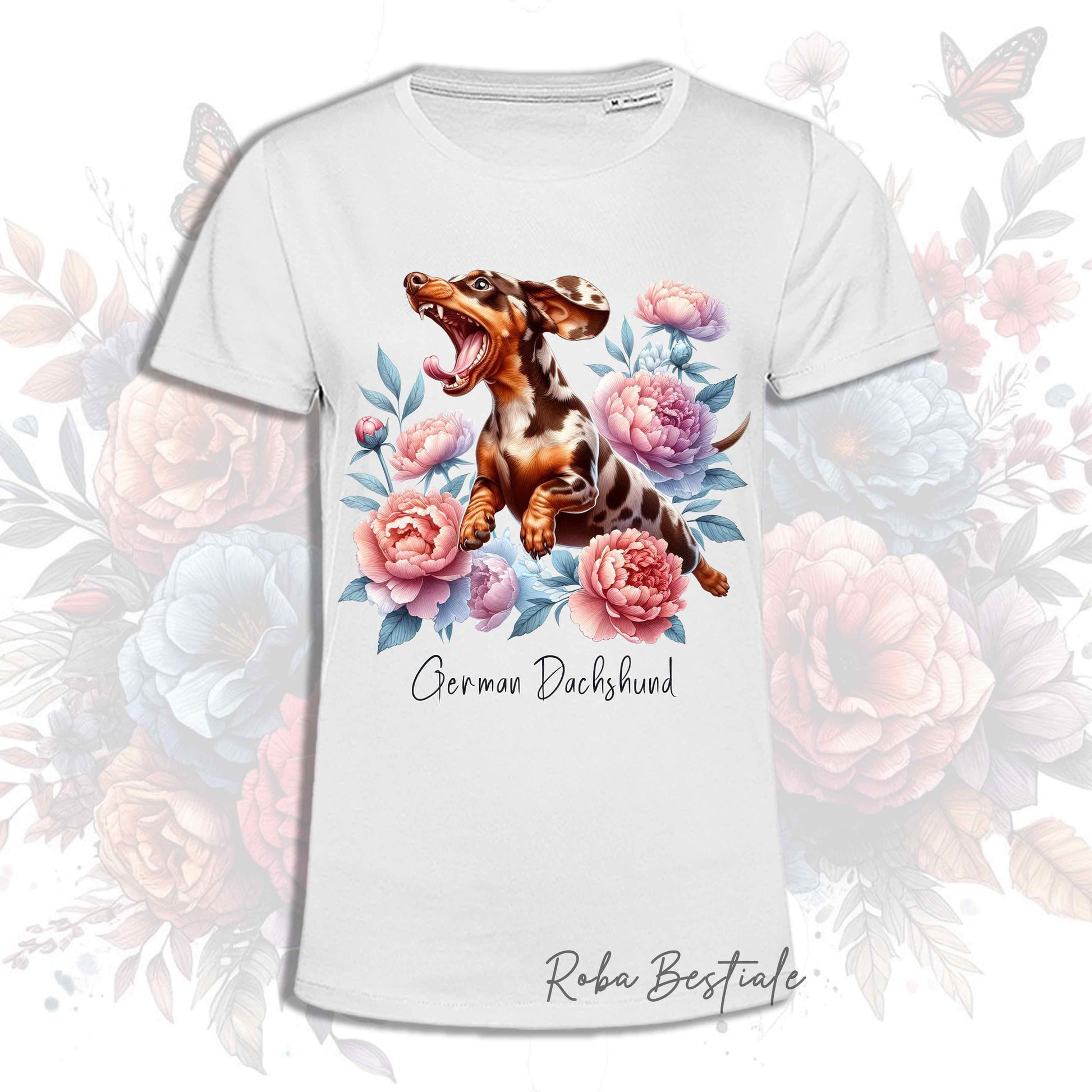 PEONY T-Shirt - Short-Haired Dachshund, Fawn Harlequin - White, Men's or Women's - XS to 5XL