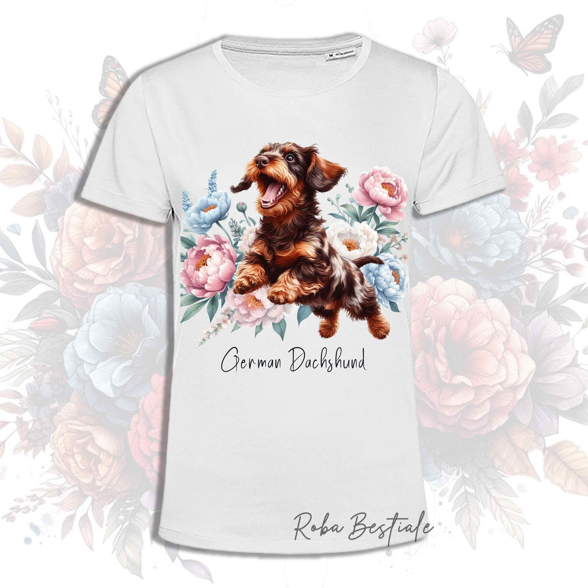 PEONY T-Shirt - Wire-Haired Dachshund, Brown Harlequin - White, Men or Women - XS to 5XL