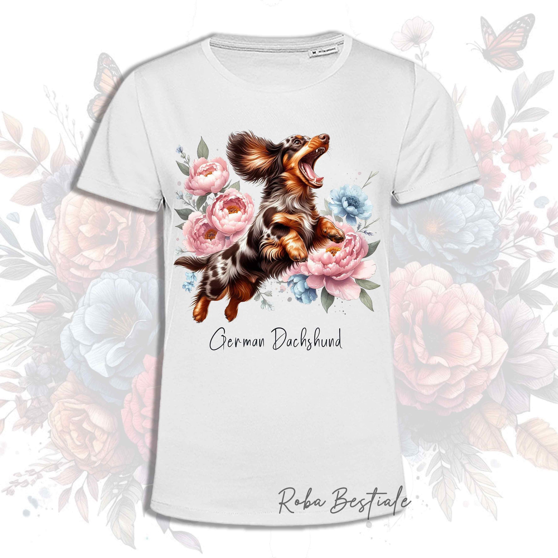 PEONY T-Shirt - Long-Haired Dachshund, Brown Harlequin - White, Men or Women - XS to 5XL