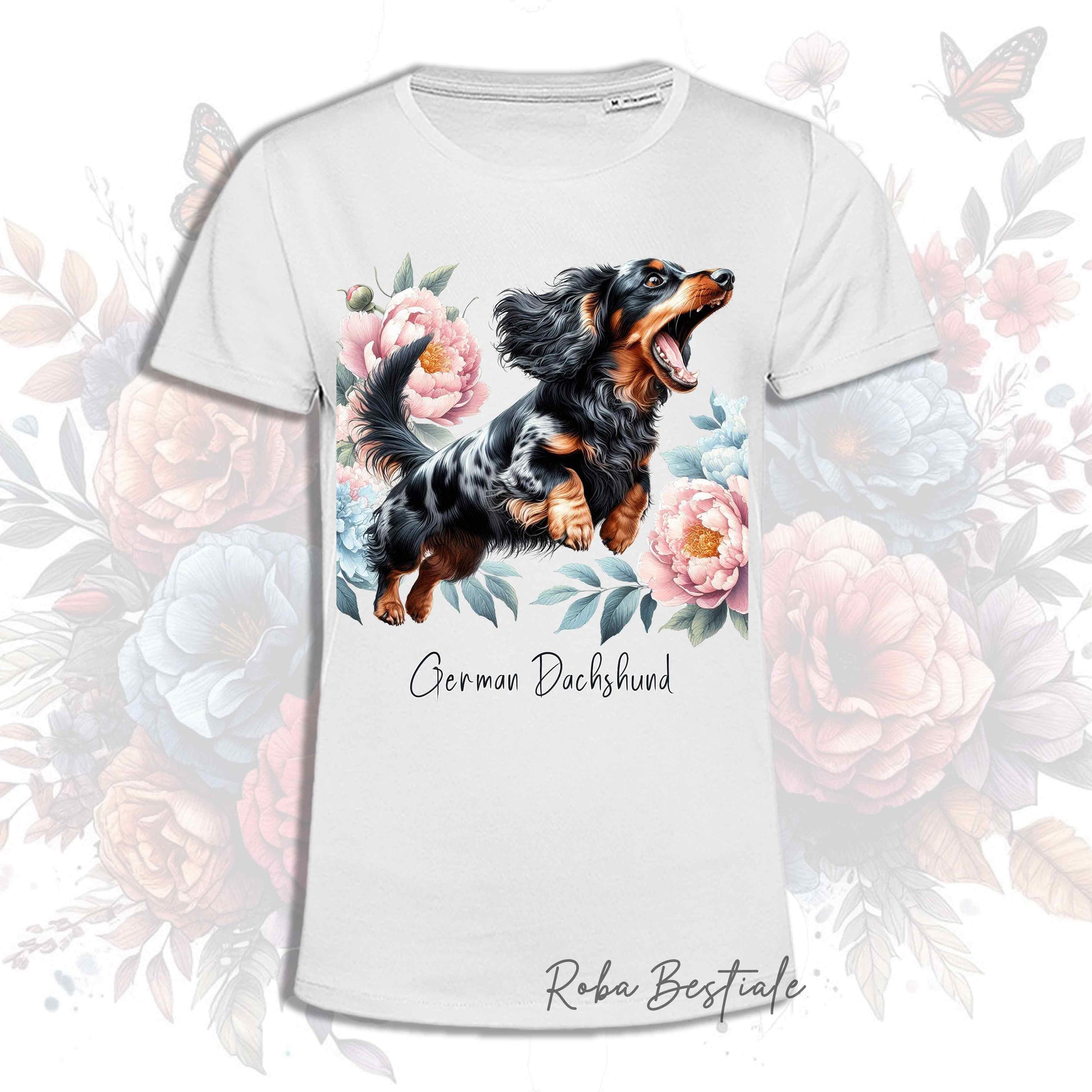 PEONY T-Shirt - Long-Haired Dachshund, Black Harlequin - White, Men or Women - XS to 5XL