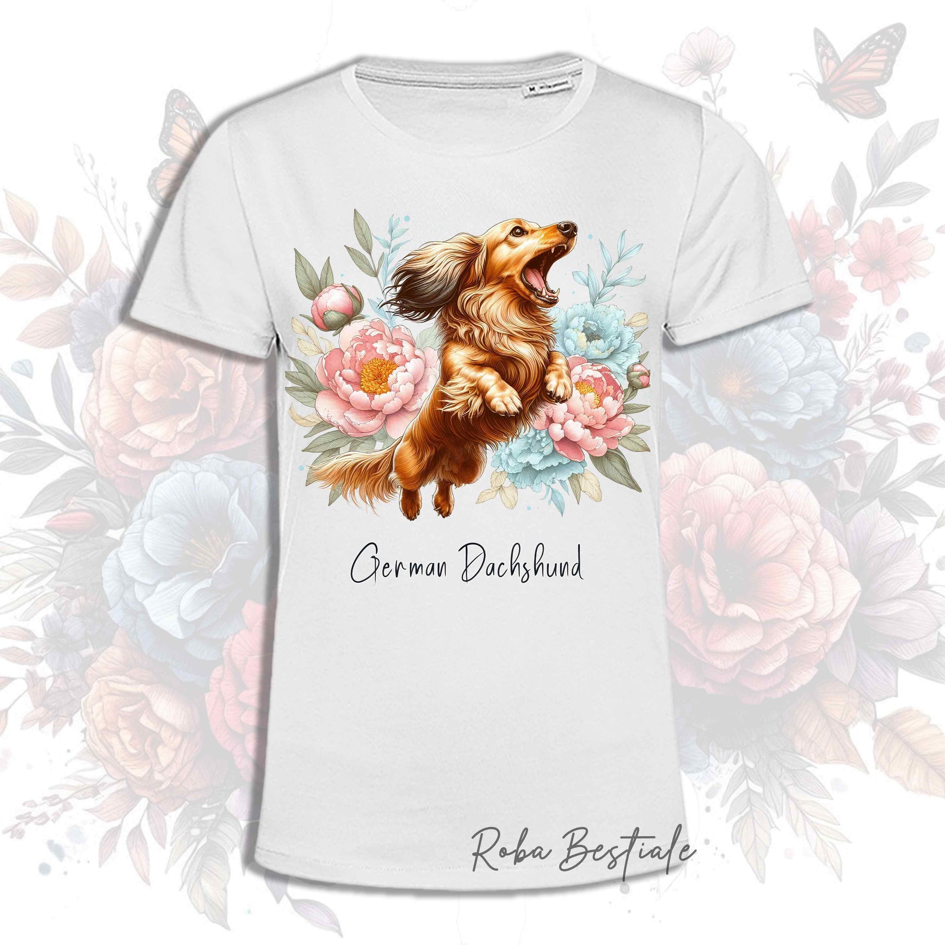 PEONY T-Shirt - Long-Haired Dachshund, Fawn - White, Men or Women - XS to 5XL