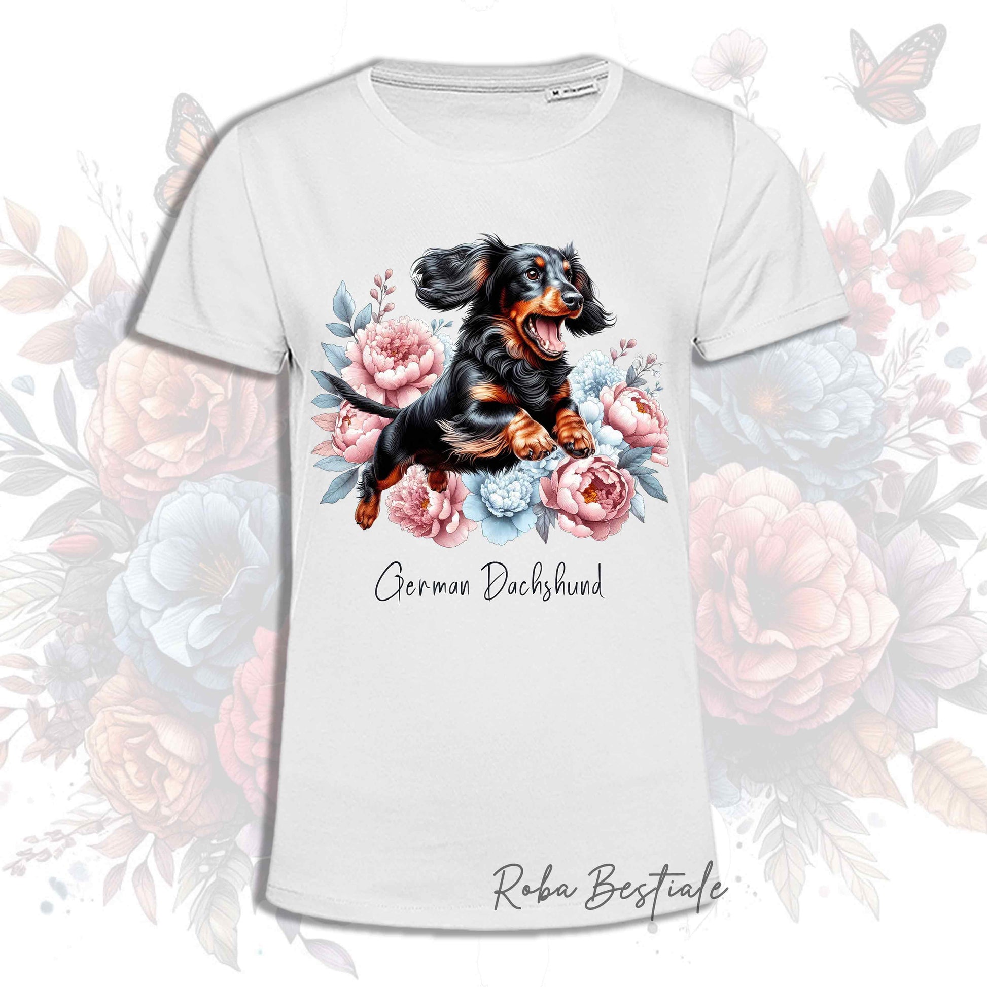 PEONY T-Shirt - Long-Haired Dachshund, Black and Tan - White, Men or Women - XS to 5XL