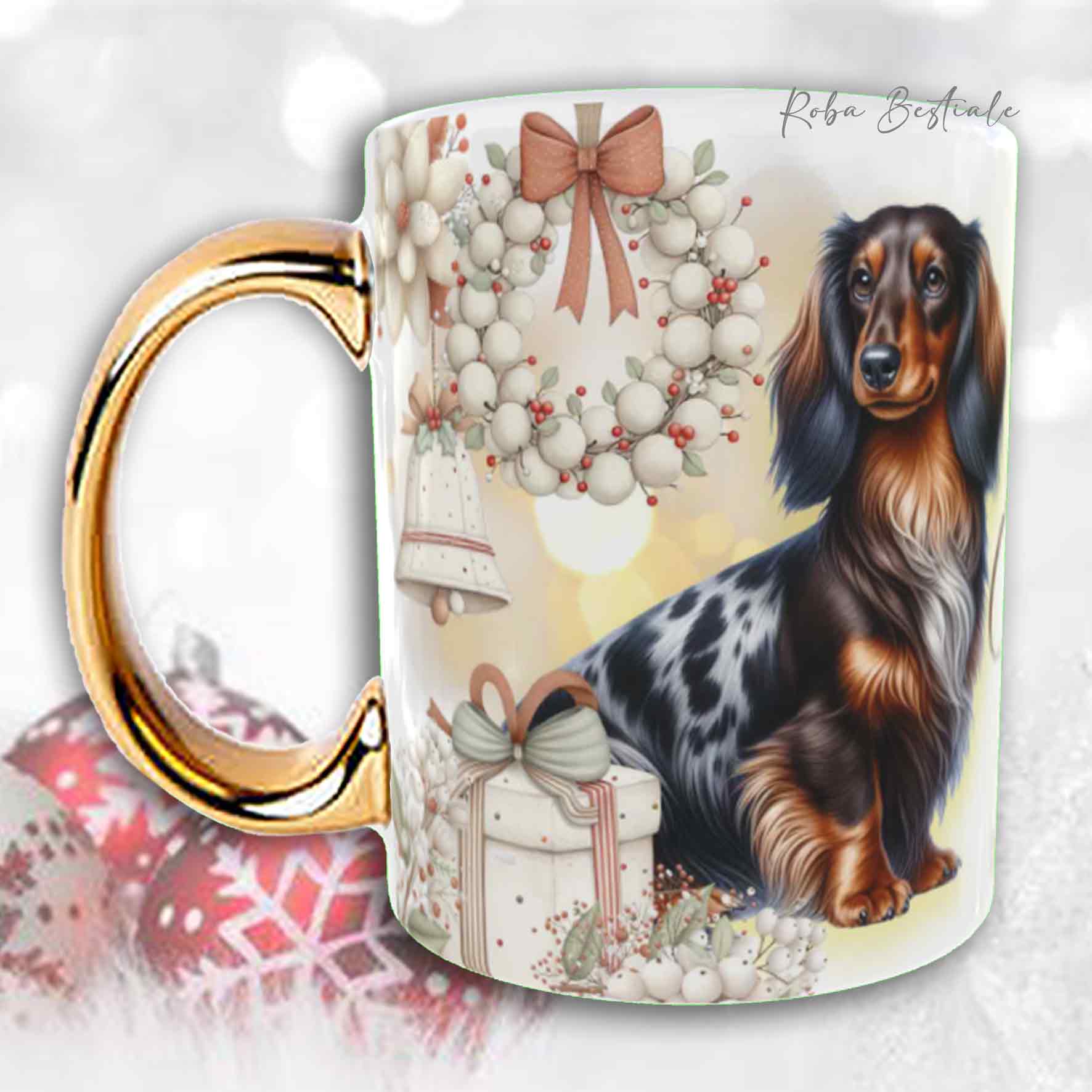 Tazza COZY WINTER - BASSOTTO TEDESCO a Pelo Lungo Arlecchino Marrone - In Ceramica, con manico color Oro - 330 ml