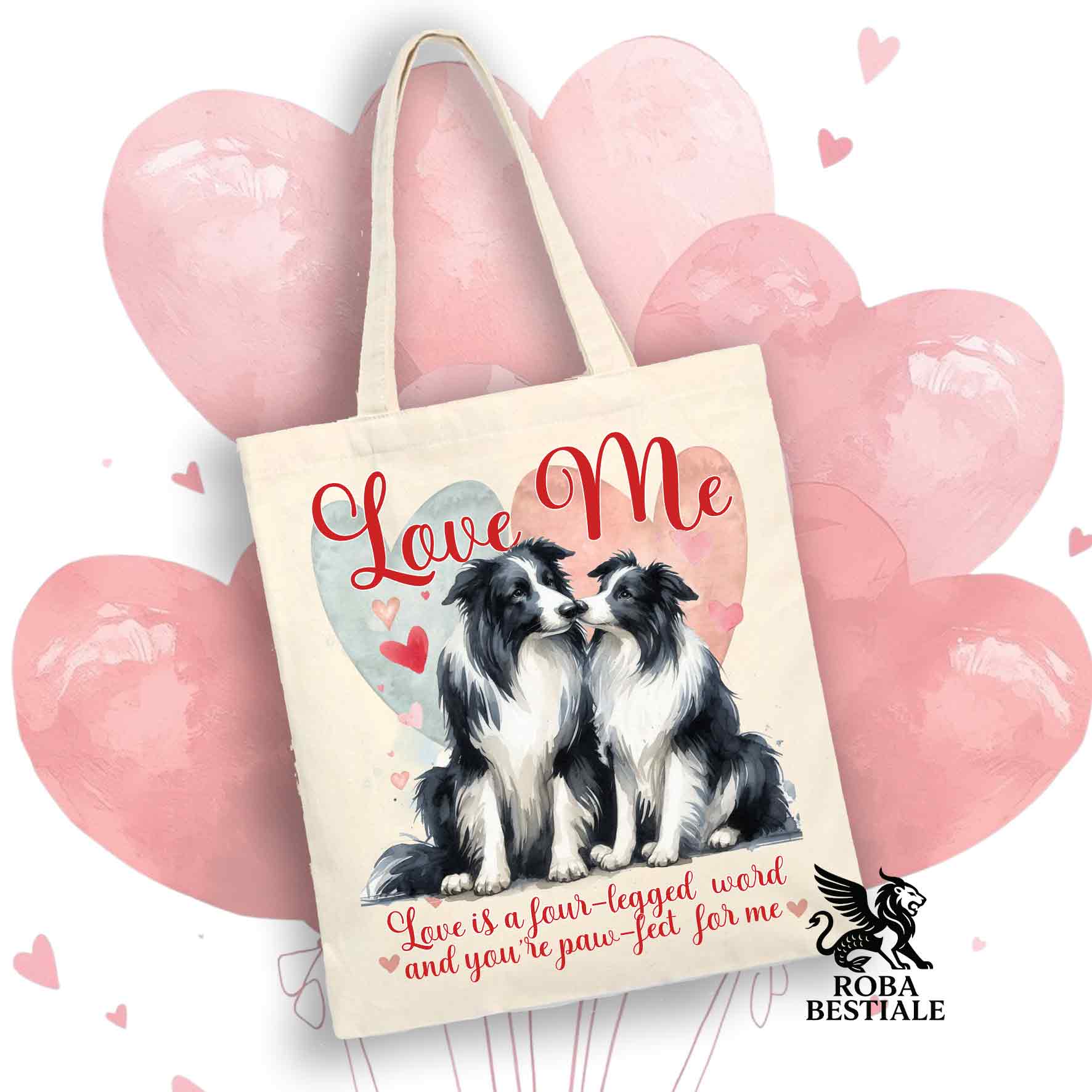 Tote Bag LOVE ME - BORDER COLLIE Bianco e Nero - 100% Cotone - Bianca o Beige
