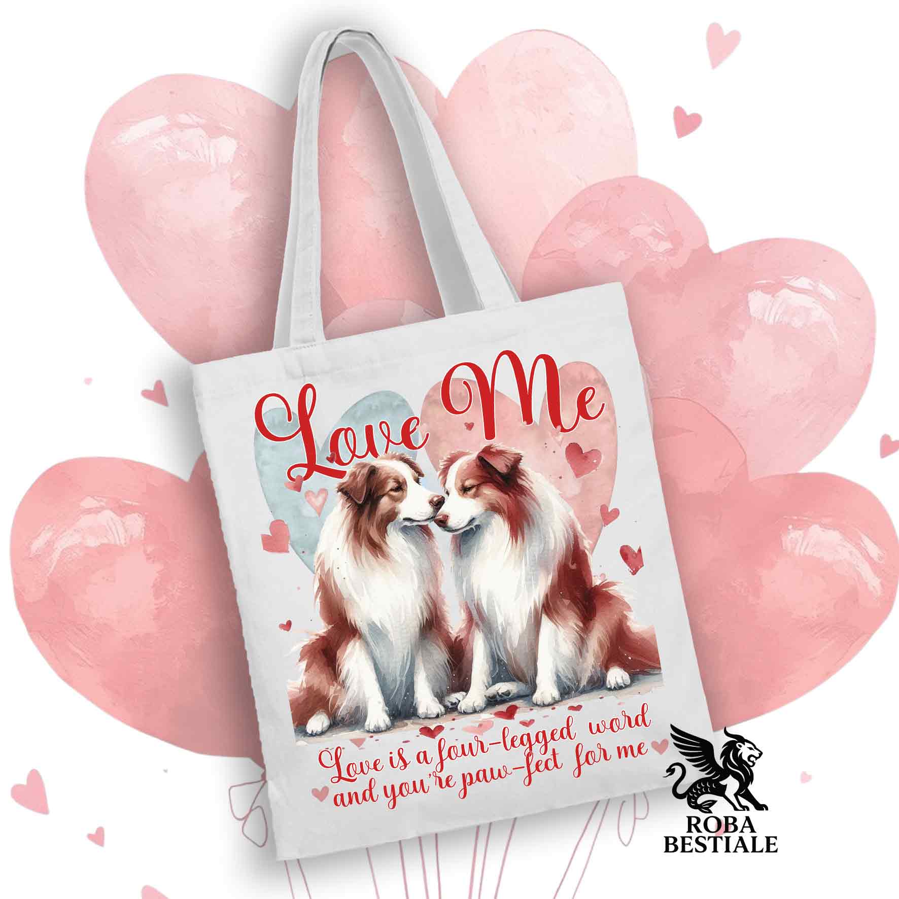 Tote Bag LOVE ME - BORDER COLLIE Bianco e Rosso - 100% Cotone - Bianca o Beige