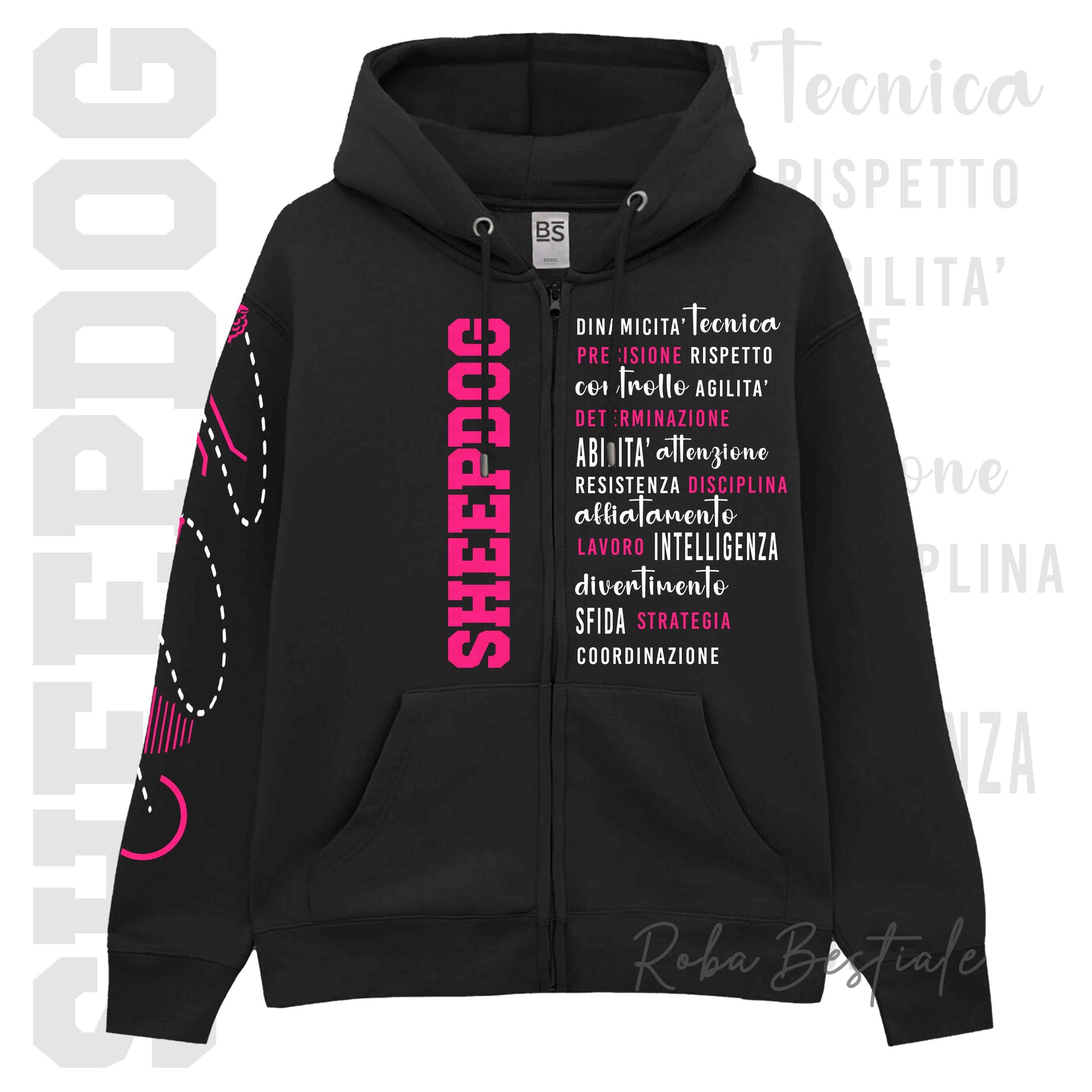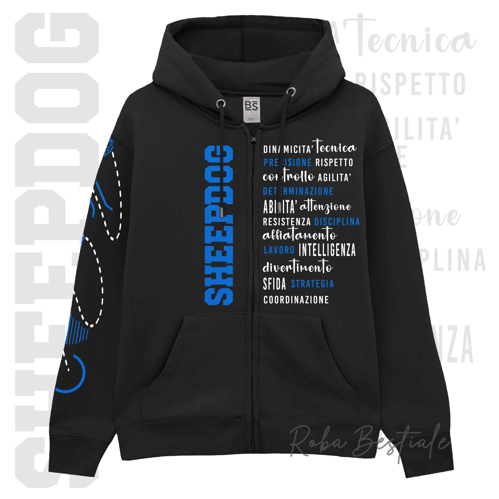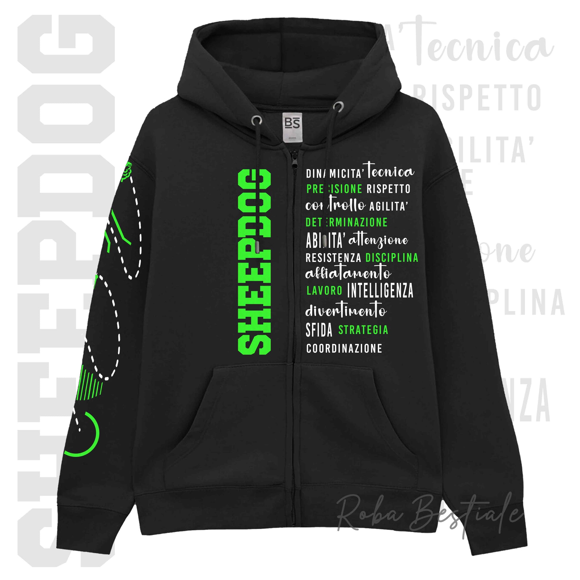 Felpa Zip DESCRIPTION - SHEEPDOG - Unisex - Nera - Dettagli in Colore a Scelta - dalla XS alla 3XL