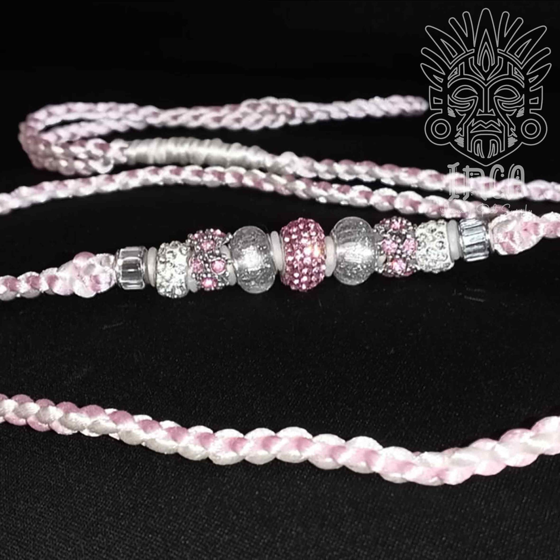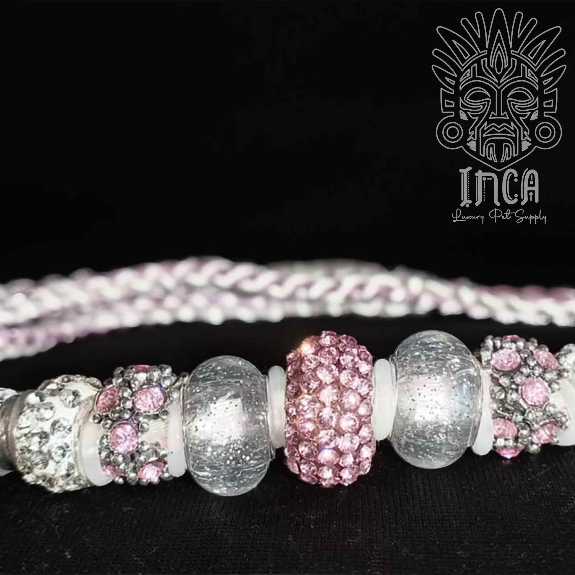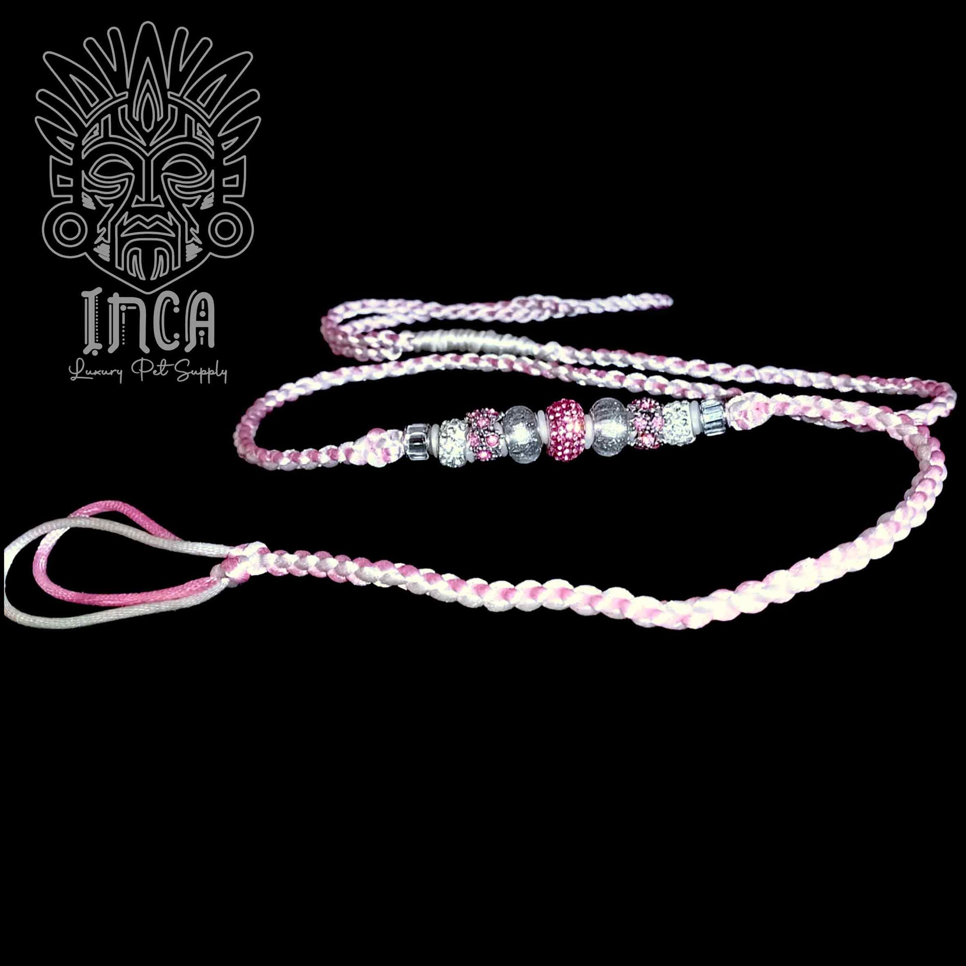 Guinzaglio da Show INCA LUXURY - In Raso Bianco e Rosa, con perle e asola per collare - 1 mt