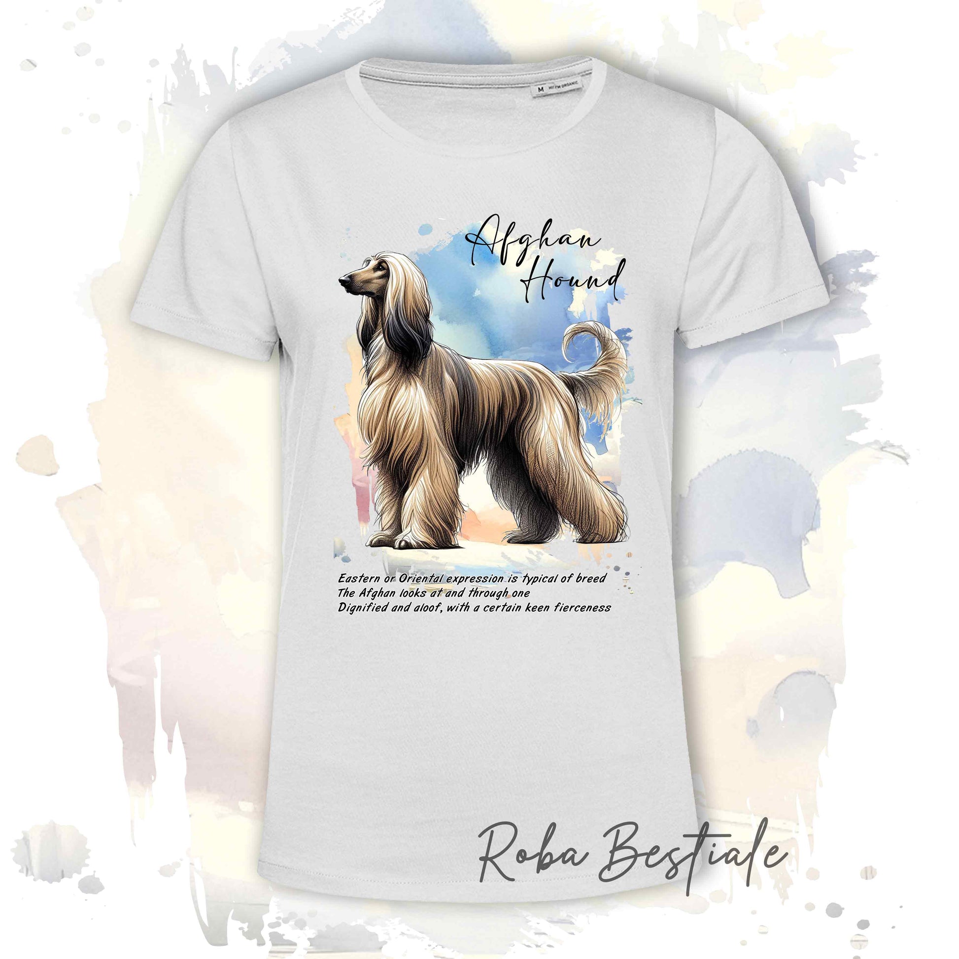 T-Shirt BEHAVIOR - LEVRIERO AFGANO Zibellino - Standard FCI - 100% Cotone, Bianca, Uomo o Donna - dalla XS alla 5XL