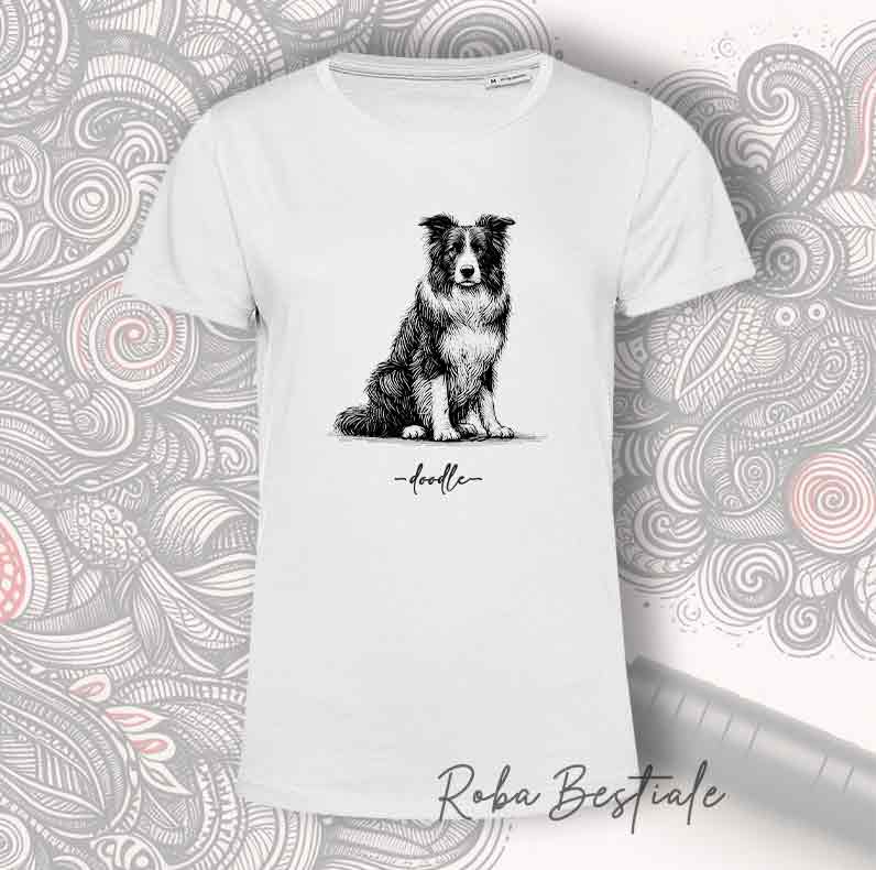 T-Shirt DOODLE - BORDER COLLIE Bianco e Nero- Bianca, Uomo o Donna - dalla XS alla 5XL