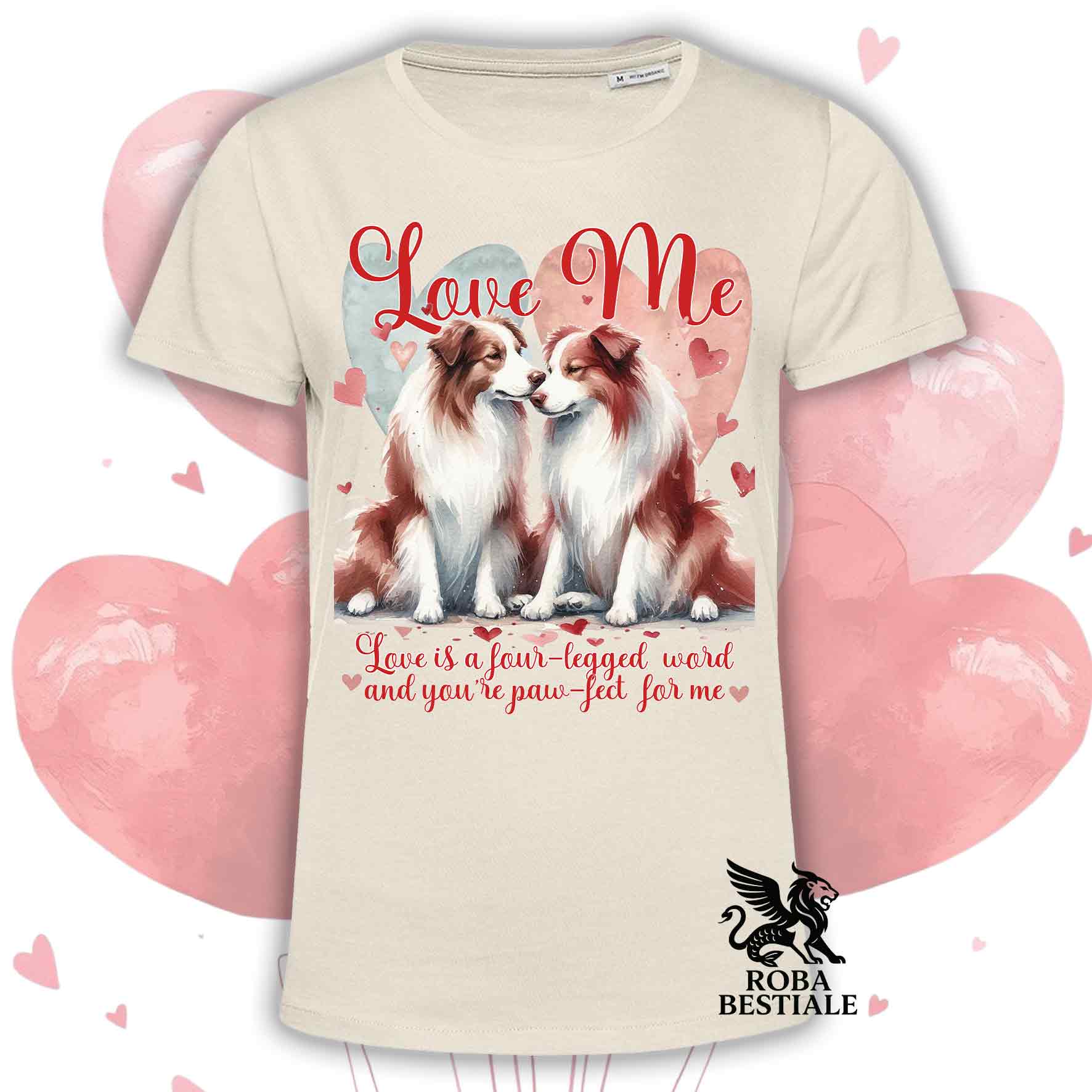 T-shirt LOVE ME - BORDER COLLIE Bianco e Rosso - Bianca o Beige, Uomo o Donna - dalla XS alla 5XL