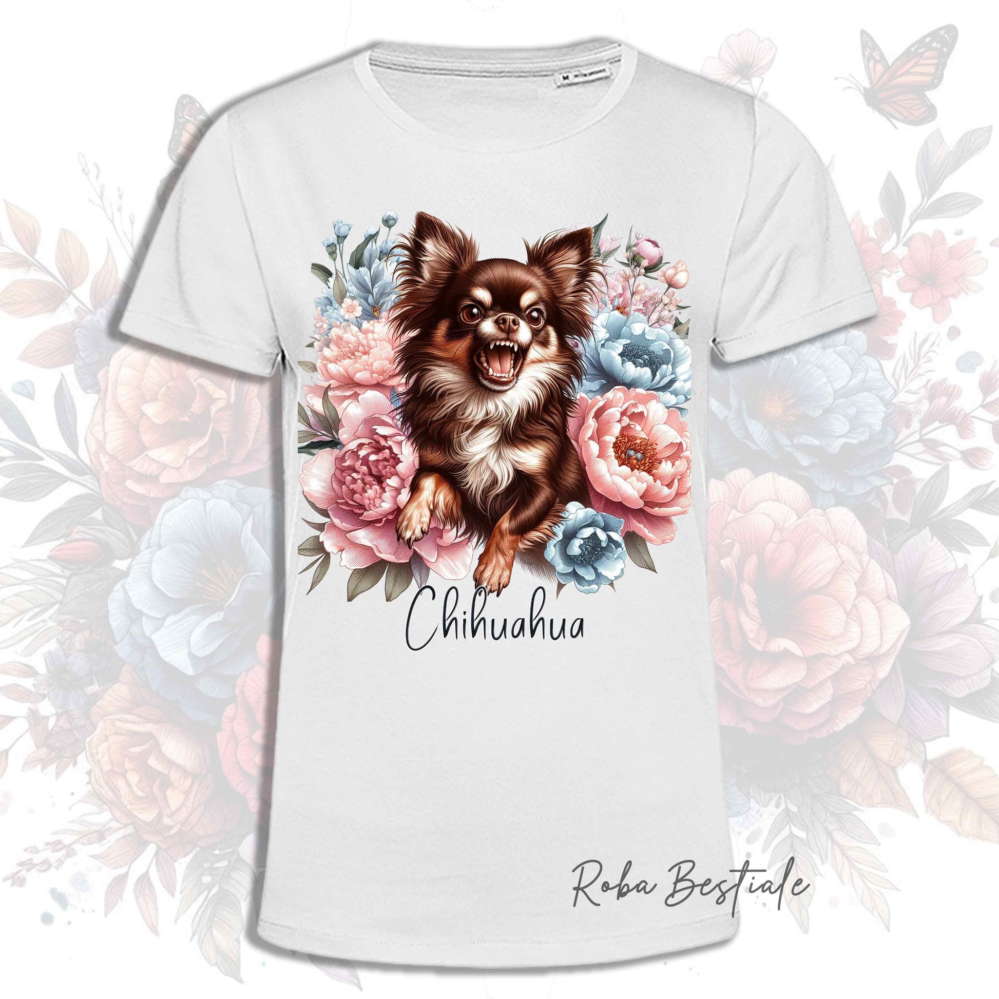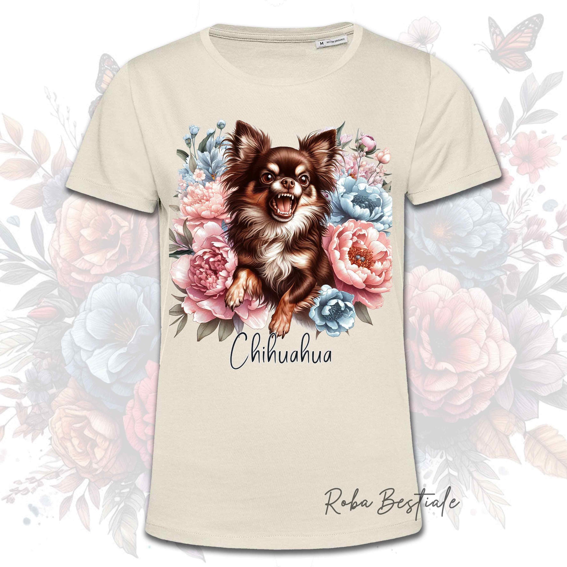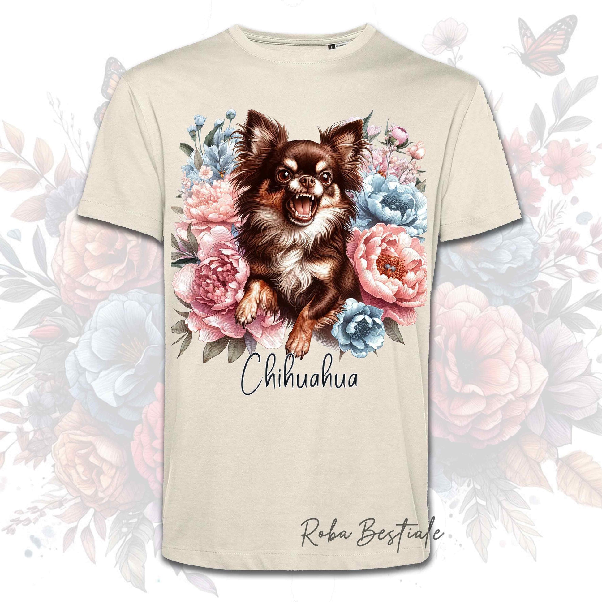T-Shirt PEONY - CHIHUAHUA a Pelo Lungo Cioccolato - Bianca o Beige, Uomo o Donna, dalla XS alla 5XL