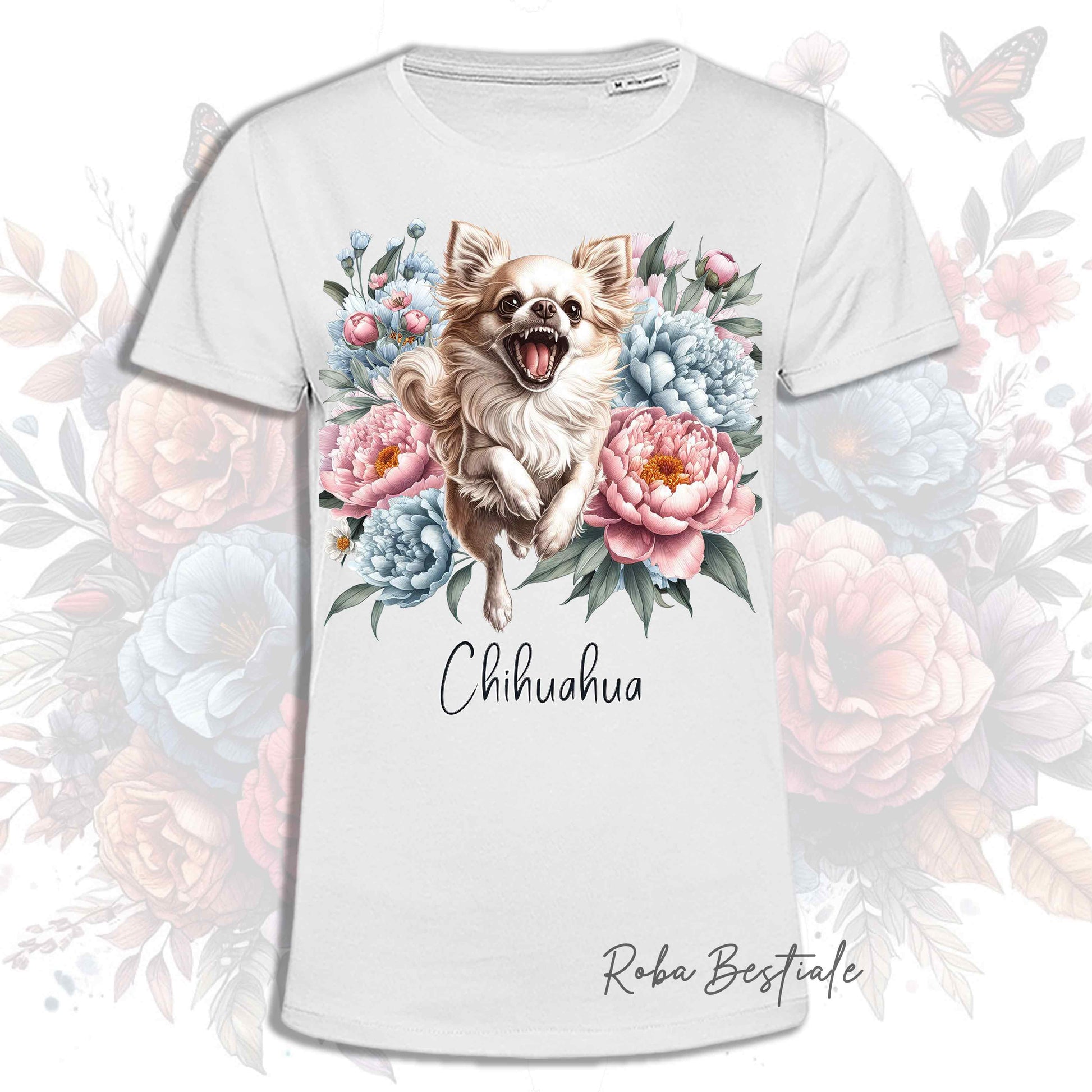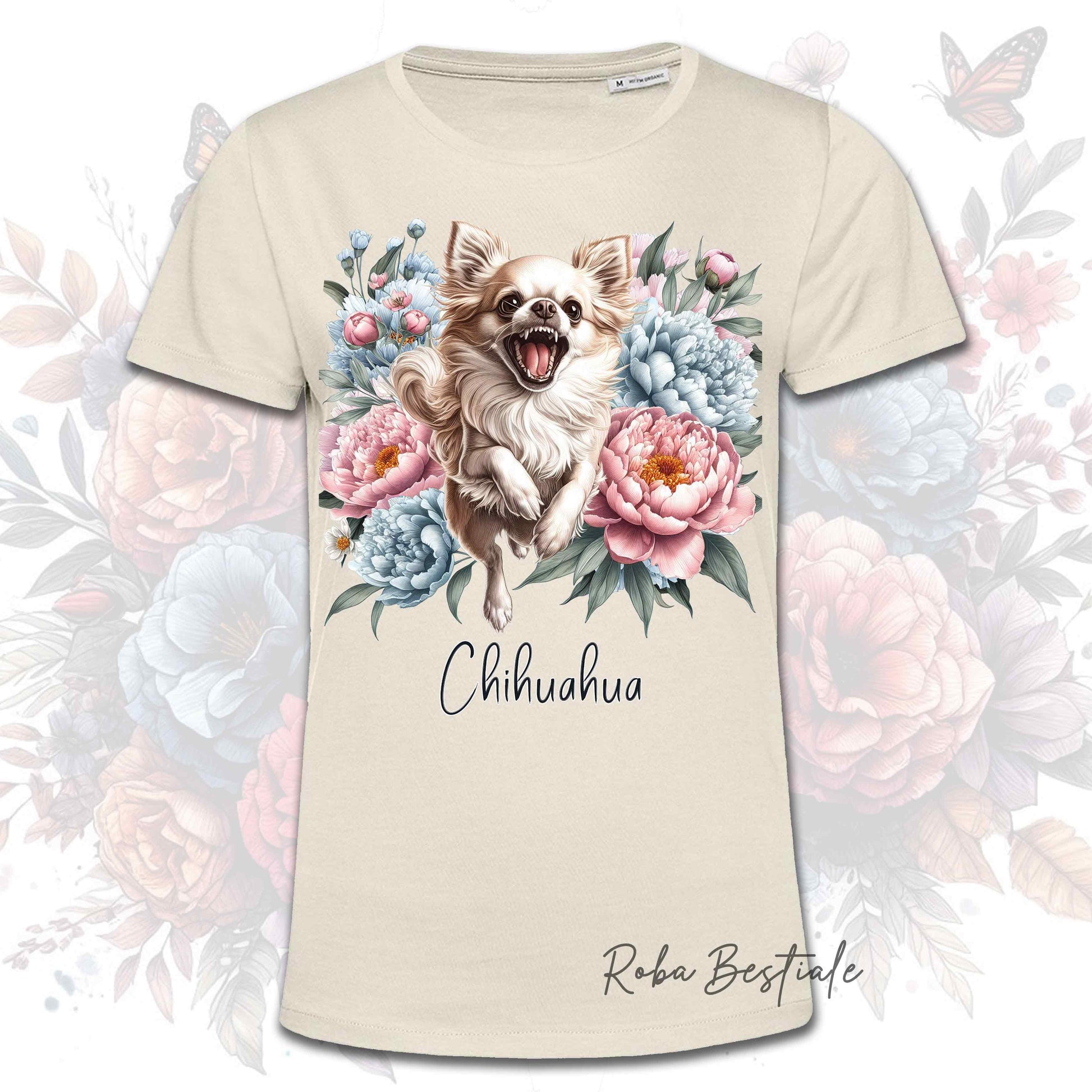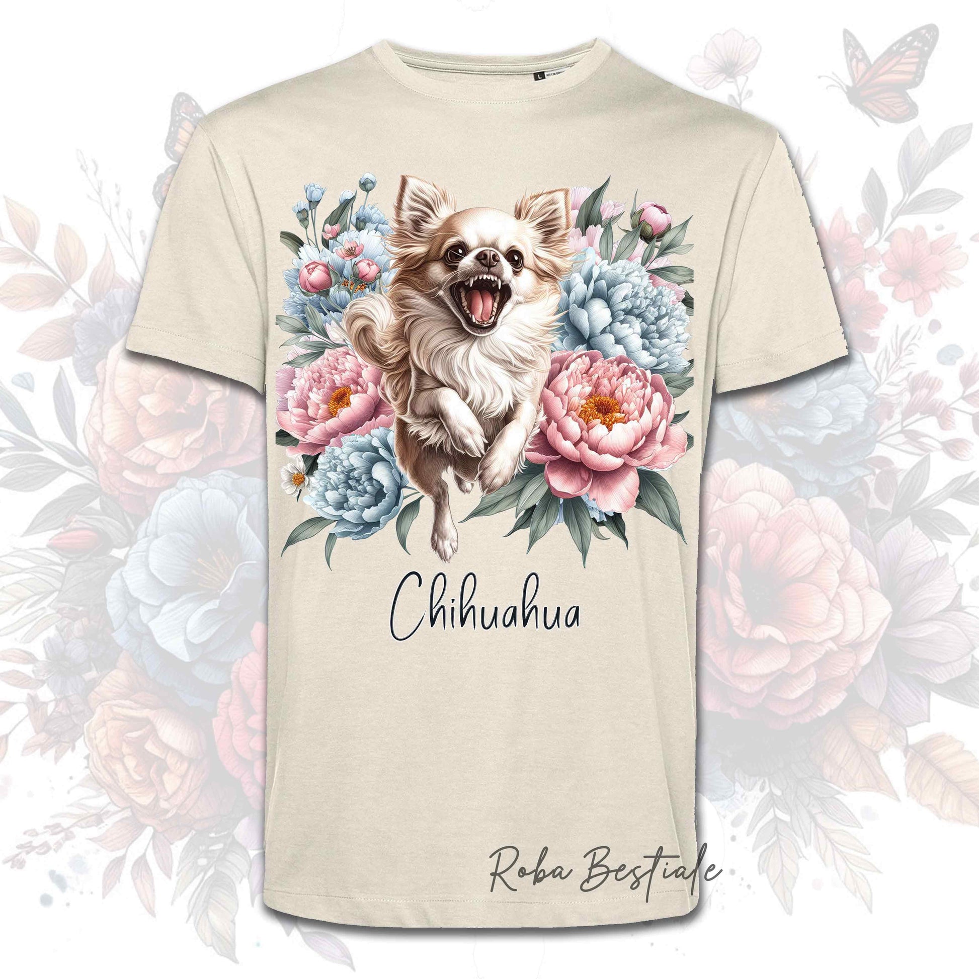 T-Shirt PEONY - CHIHUAHUA a Pelo Lungo Crema - Bianca o Beige, Uomo o Donna, dalla XS alla 5XL