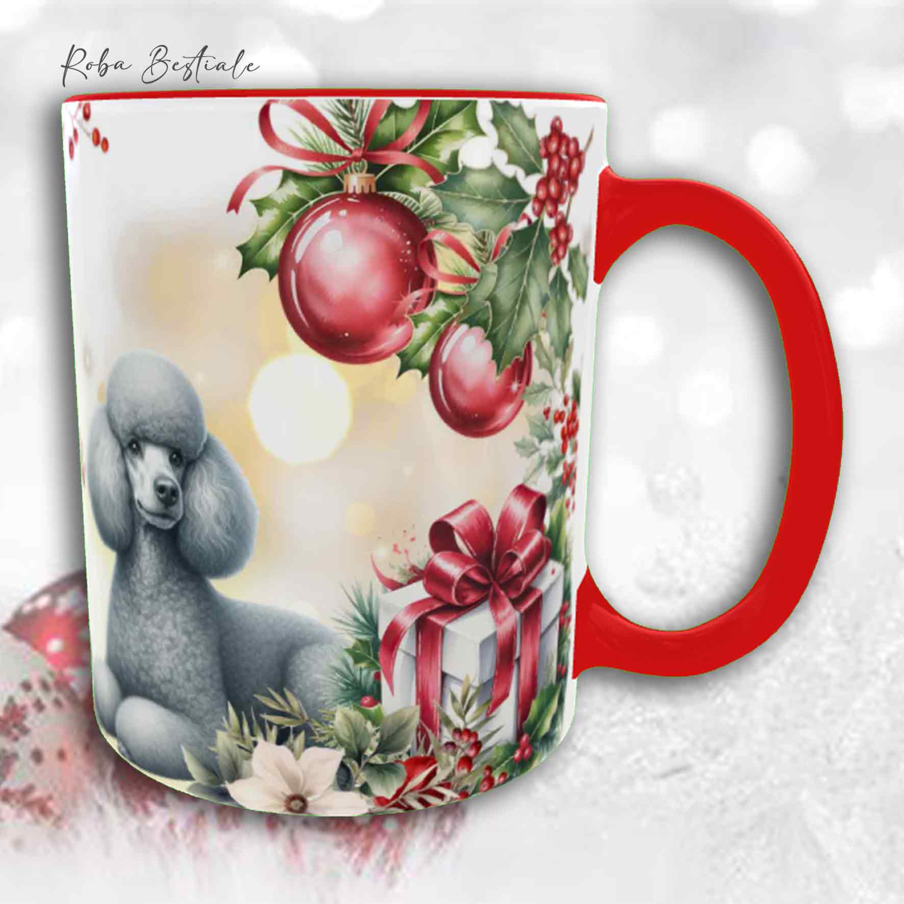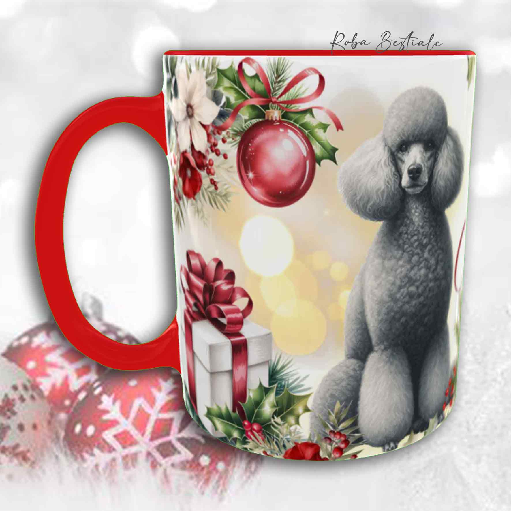 Tazza VINTAGE WINTER - BARBONE Media Mole Grigio Argento - In Ceramica, con dettagli Rossi - 330 ml